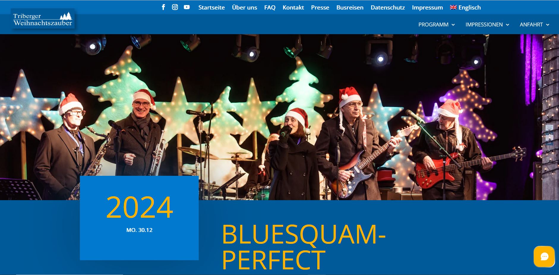 Triberger Weihnachtszauber, Naturbühne BQP 15:00 - 15:30 Uhr, 16:20-16:50 Uhr, 18:00-18:50 Uhr, 20:00-21:00 Uhr Stimmungsbilder: https://www.youtube.com/watch?v=rrfH-89mNsY |